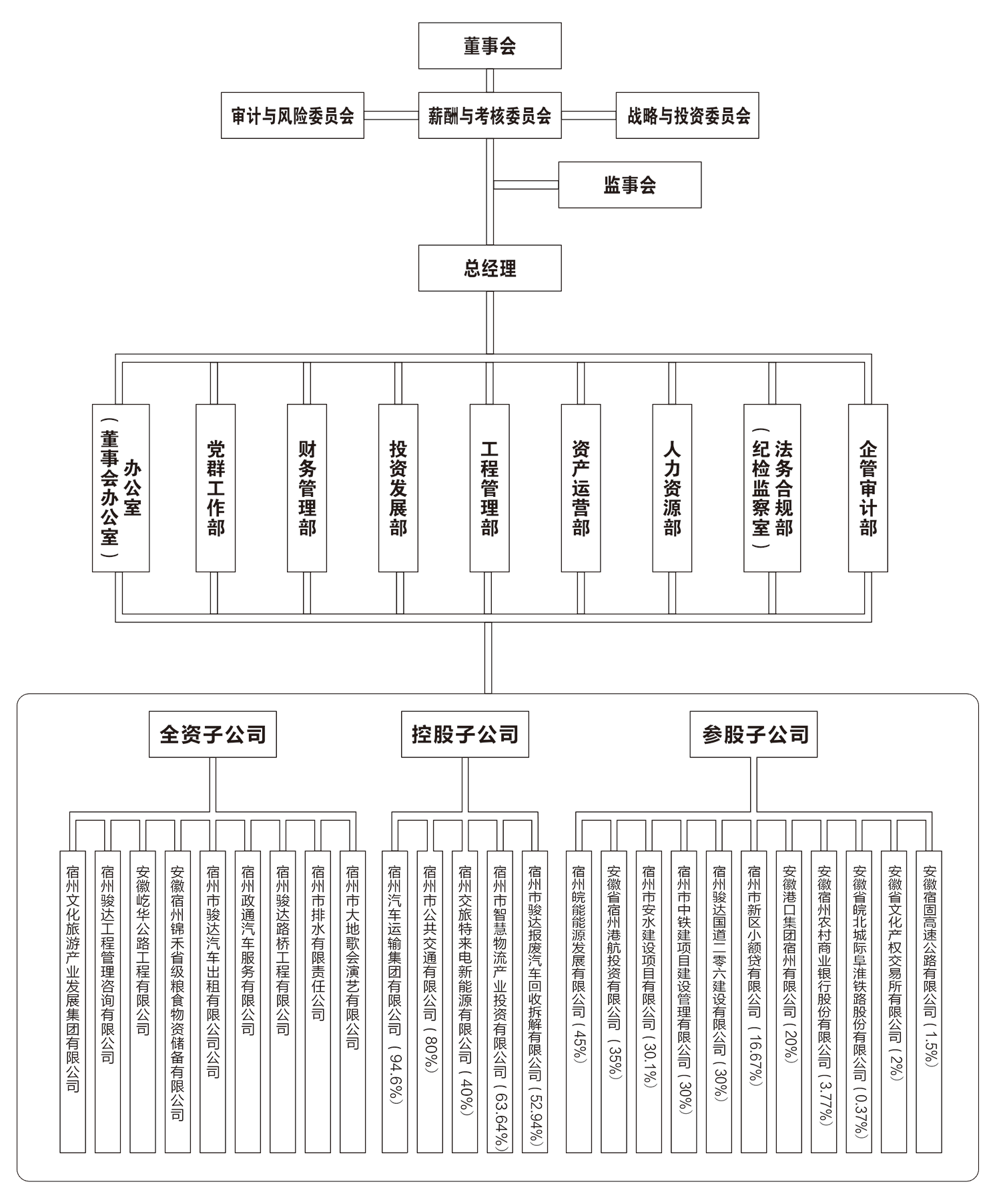 宿州交通文化旅游投资集团有限公司是在原宿州交通投资集团有限公司(2012年9月成立)基础上组建而成,于2018年1月8日正式揭牌,是宿州市人民政府出资设立的国有独资公司,具有一级法人资格,注册资本金30亿元,总资产138.18亿元,是宿州市交通、文化、旅游产业发展的投融资平台和国有资本运营公司,主要承担全市交通、文化、旅游产业的投资、建设与运营管理任务。集团机关内设机构9个:办公室(董事会办公室)、党群工作部、财务管理部、投资发展部、工程管理部、资产运营部、人力资源部、法务合规部(纪检监察室)、企管审计部;下属全资子公司9个,控股子公司5个,参股子公司11个。